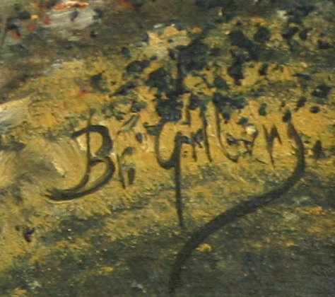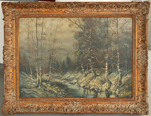 ILLEGIBLY SIGNED WINTER STREAM O/C: Circa 1930's, 20'' x 27 1/2'', period gesso frame with wear, 27 1/2'' x 34''. Needs cleaning.