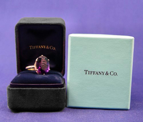 TIFFANY & CO. 22ctw AMETHYST & DIAMOND RING: Vibrant oval cut amethyst, measuring 13.6 x 18 x 10mm, prong mounted in 18k yellow gold with tiny diamonds set in to shank, size 7, 8.3 grams. Signed Peretti 750 Tiffany & Co., original boxes.