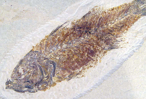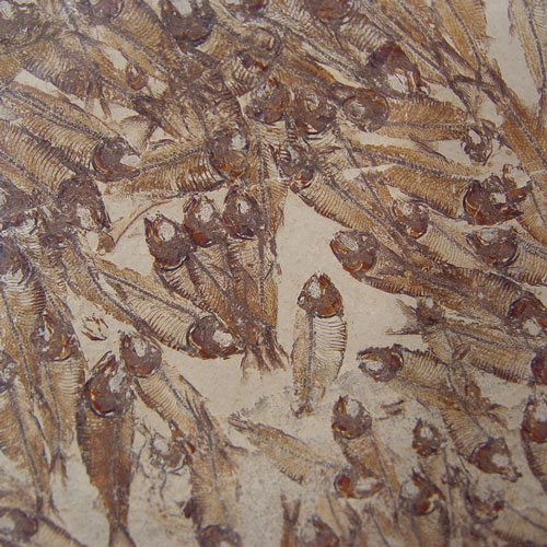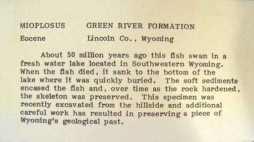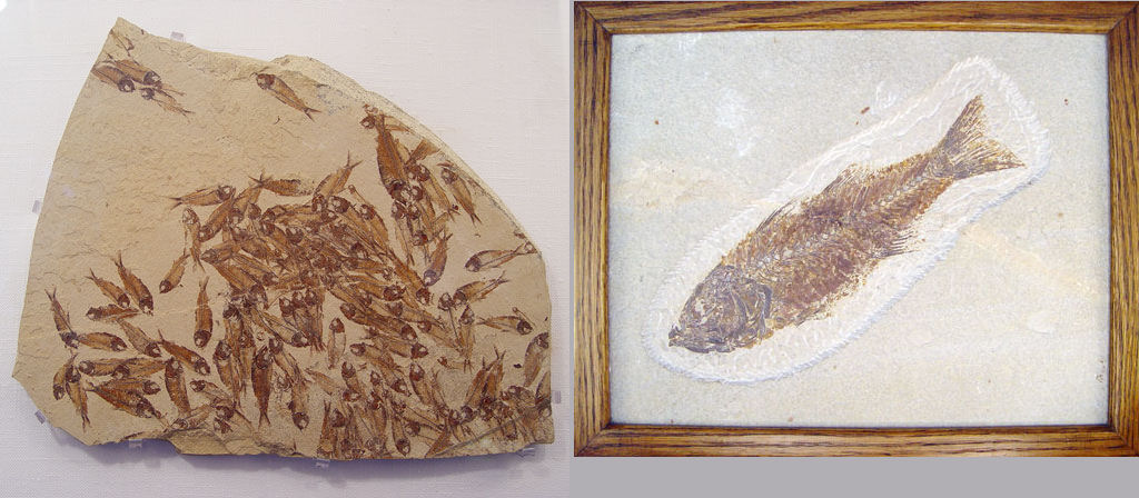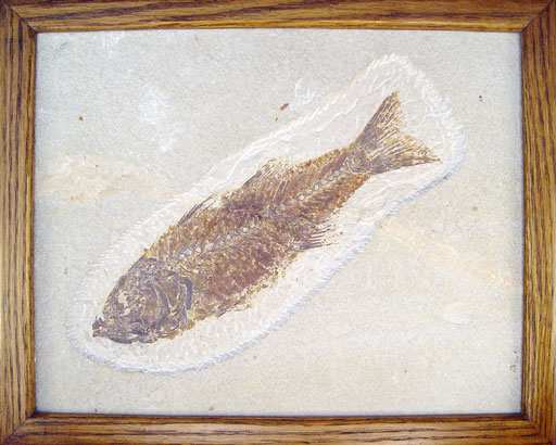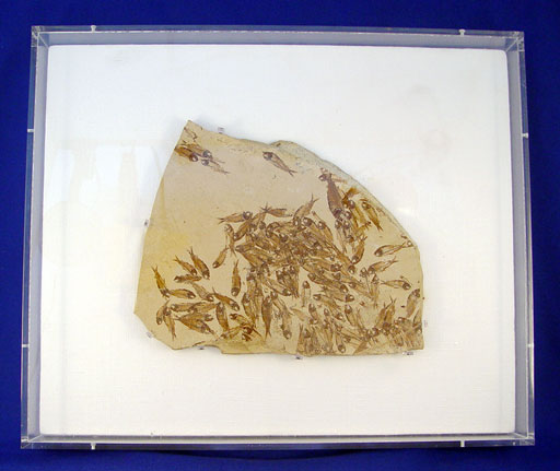 2 WYOMING GREEN RIVER FORMATION FISH FOSSILS: 1) Herring fish fossil grouping, 40,000 years old, 10'' x8'', professionally framed under lucite, 15.5 x 18.5''. 2) Mioplosis, 10-12 1/4'', framed in oak.