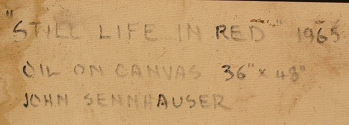 SENNHAUSER, John, (American, 1907-1978): Still Life in Red 1965, O/C, 36'' x 48'', signed/dated 1965, signed and titled verso. Ervin Litkei Collection Est. $2000/4000**