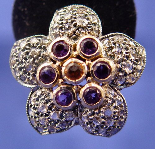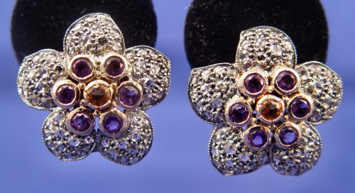 DIAMOND, AMETHYST & CITRINE EARRINGS: Georgian style post back floral motif earrings of 14k & sterling, approx. 4ctw of all stones, approx. 7/8'', 13.4 grams.