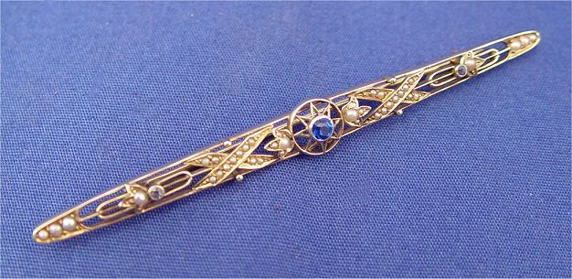 VICTORIAN SEED PEARL AND SAPPHIRE BAR PIN: Lovely open work brooch set with seed pearls and blue stones, possibly sapphires, stamped 14k, 3 7/16''l., 6 grams.