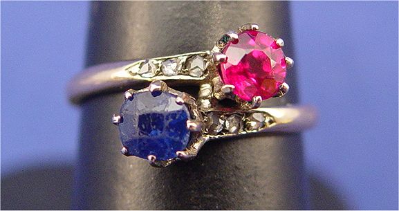 VICTORIAN BYPASS RING: Delicate bauble of 14k yellow gold (acid test) set with synthetic? sapphire and ruby with tiny diamond chips, size 6.5, 2.5 grams.