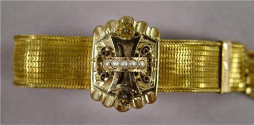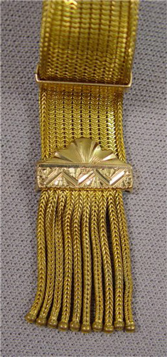 VICTORIAN SLIDE MESH BRACELET: Yellow rolled gold bracelet with etched slide with attached wire, ball and seed pearl decorations, etched straight bar and end cap with fringe ending in tiny balls. Approx. 7'' at its longest, 5/8'' wide.