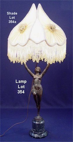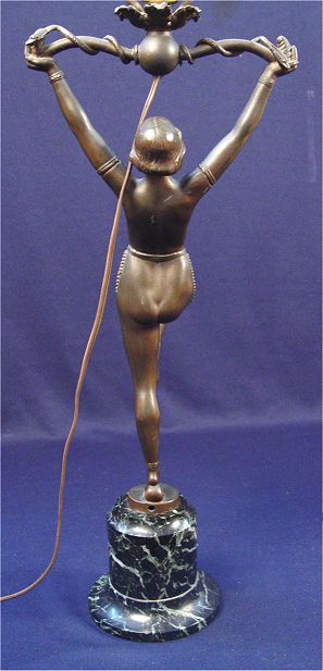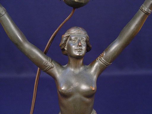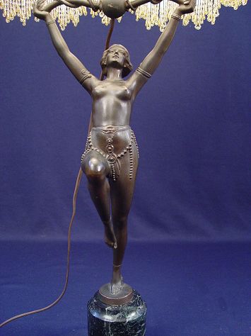 ART DECO STYLE NUDE LAMP: Female with arms aloft perched on a small marble column, 22 1/4''h. plus harp and shade of your choice. Wiring is obviously replacement and via a route different then original. The beaded shade displayed on this lamp to be sold as the following lot.