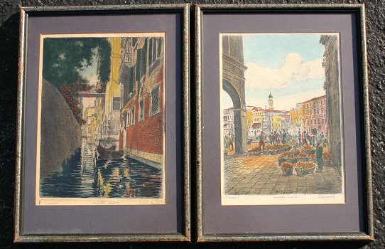 SZIKLAY, Bela, (Hungarian, 20th C.): 2 Views of Venice, Etchings, 12'' x 9'' sight size, pencil signed and titled, one of a canal, and the other a flower market, framed, 17'' x 14''.