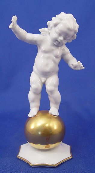 HUTSCHENREUTHER PORCELAIN CHERUB: Balanced on a gold ball, 6 1/2''h.