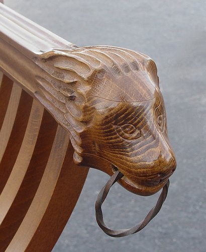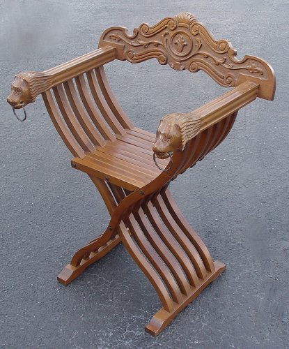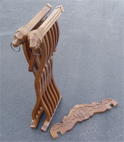 CARVED FOLDING SAVRONOLA CHAIR: Relief carved top rail, lions head hand holds, 33.5''h. x 23.5'' x 19''.