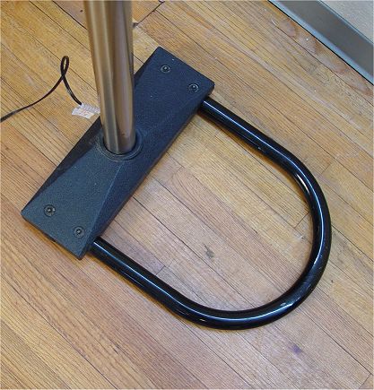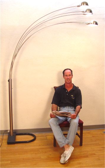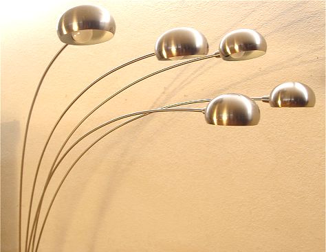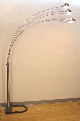 ARC 5 LIGHT MODERNE FLOOR LAMP: Polished steel body and shades, three way switch, base 17'' x 21'', approx. 92''h. with a 58'' reach.