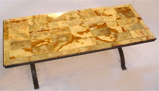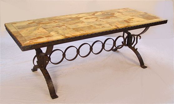 SPANISH WROUGHT IRON AND MARBLE COFFEE TABLE: 21''h. x 59'' x 24''.