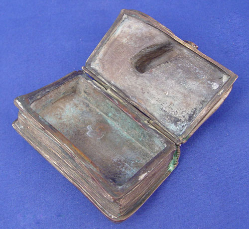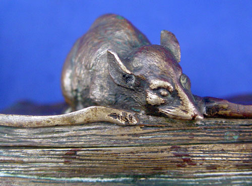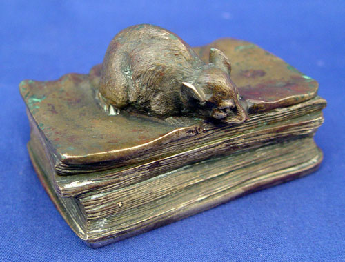 BRONZE BOOK AND MOUSE MATCH BOX: Match box in shape of book ''Odeur de Paris'' with striker to bottom and mouse to hinged lid, approx. 3 5/8'' x 2 1/4'' x 2''h.