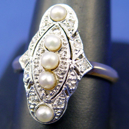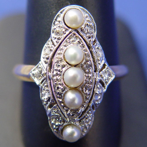 ANTIQUE STYLE PEARL AND DIAMOND RING: Filigree top of white gold set with five 3.3mm pearls and encrusted with tiny diamonds, shank of yellow gold, acid tested 14k, size 11, 5.4 grams.