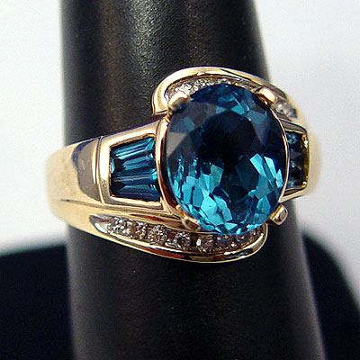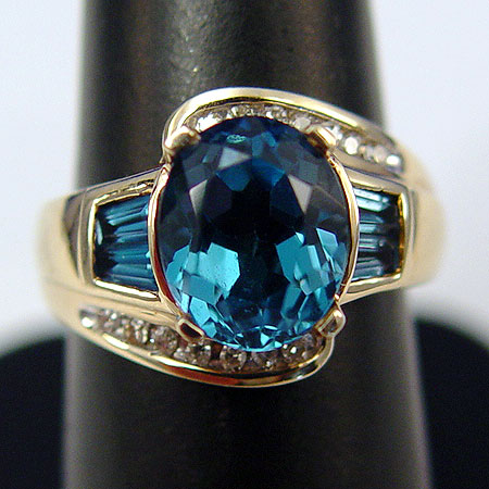 BLUE TOPAZ AND DIAMOND RING: Oval cut irradiated blue topaz, 8 x 10 x 5.7mm, set in yellow gold with four baguette cut topaz and 14 small round cut diamonds, shank stamped 14k, size 7.25, 4.4 grams.