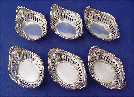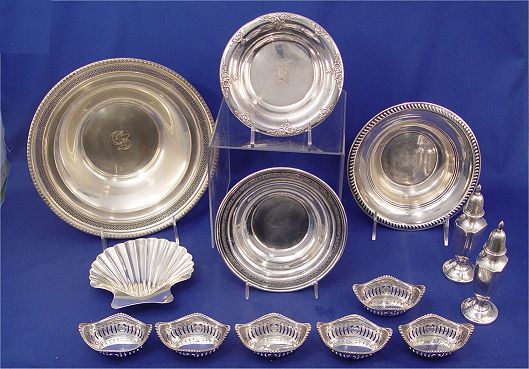 ESTATE COLLECTION OF STERLING: To include, Frank M Whiting Co bowl D207 with pierced rim, center monogram CS, dated verso 1931, 9 1/4''dia.; Webster Co. low bowl with embossed floral design, 505, monogrammed F?, 5 5/8''dia.; 6 Webster Co. reticulated nut dishes with bead trim edges; two small bowls with illegible marks, shell dish marked Sterling 1748xx with small dent and a set of salt and pepper shakers with a mark very similar to Fisher Silversmiths. Sold as a lot. Est. $250/350**