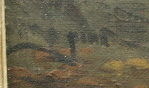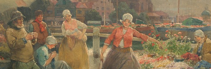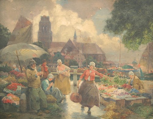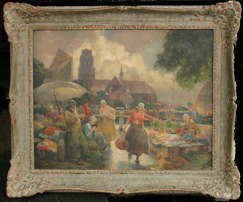 ILLEGIBLY SIGNED EUROPEAN FLOWER MARKET PAINTING: O/Canvas/Board, 22'' x 28'', worn carved frame, 29'' x 34''. Laid to board, several paint flecks scattered throughout, skinned in several areas.