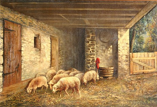 DeRAYNE, Thomas, (American, 1839-1936): Sheep Grazing Hay in a Barn Pen, O/C, 12'' x 18'', signed, original frame, 17'' x 23''.
