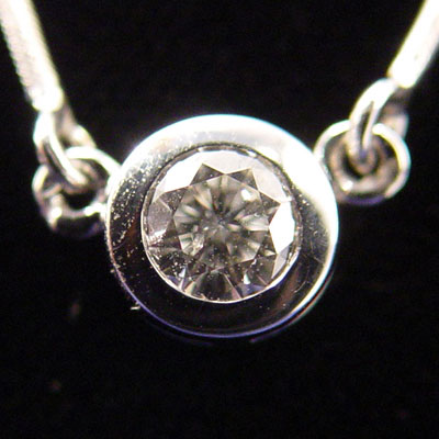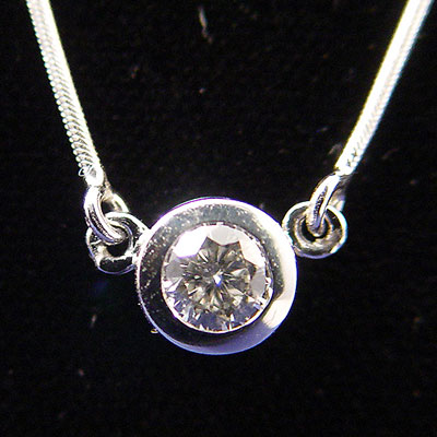 1/3ct DIAMOND NECKLACE: Bezel set round brilliant diamond of approx. 1/3ct in 14k white gold pendant attached to snake chain, approx. 18''l., 4 grams. Originally purchased for $950 at Burdines-Macy's.