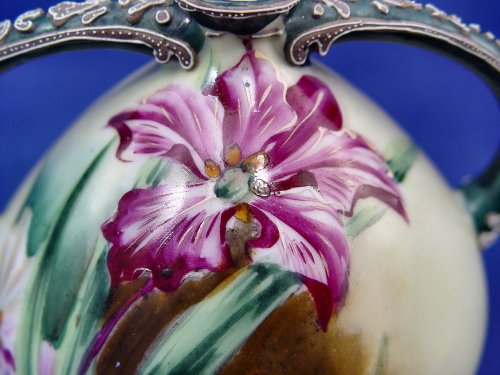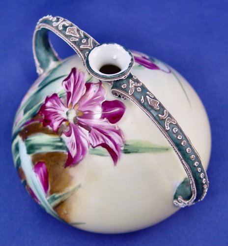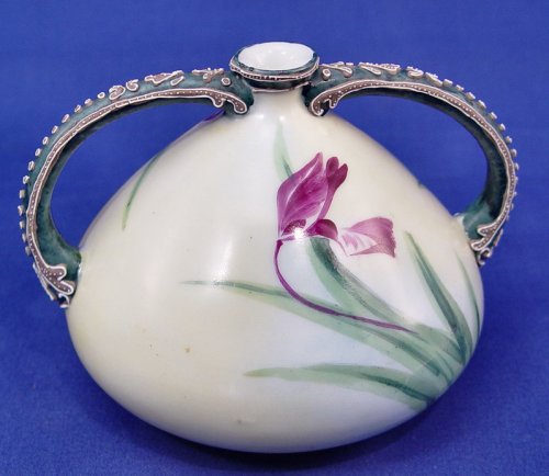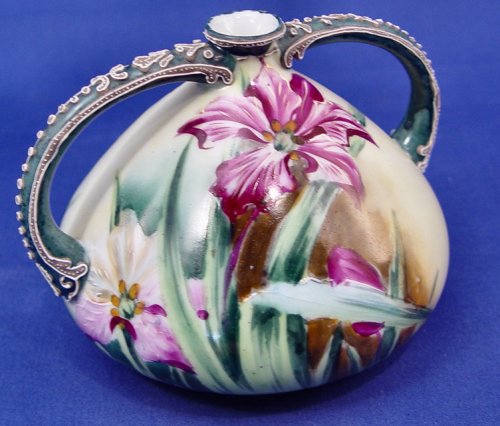 ROYAL MORIYE NIPPON DOUBLE HANDLED VASE: Lovely little vase with purple iris decoration, overall approx. 6 1/2''w. x 3 3/4''h.