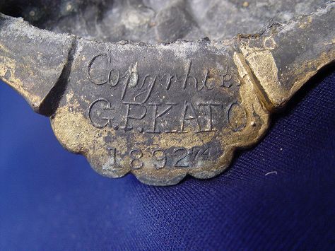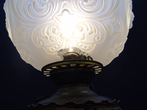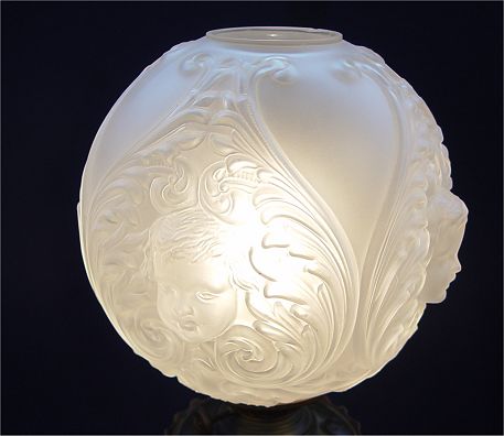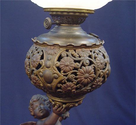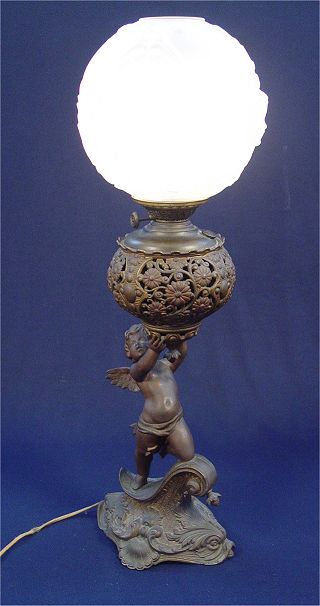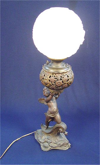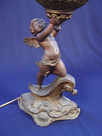 G.P. KATO CONVERTED OIL LAMP IN A CHERUB MOTIF: Adorable winged cherub base holding aloft the wonderful puffed cherub shade, unfortunately damaged but can be hidden in the back. Bottom of fixture marked G.P.Kato 1892 74, 32''h. overall.