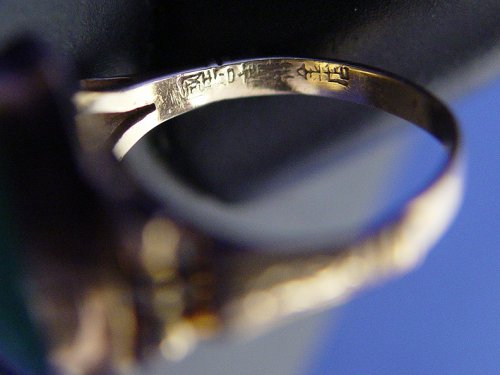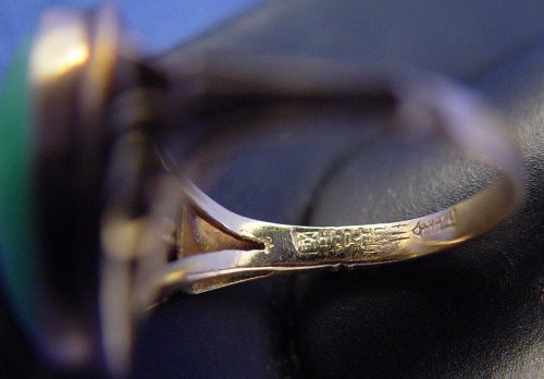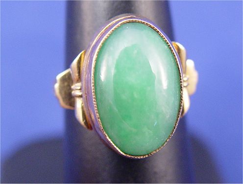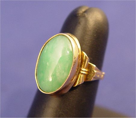 CHINESE JADE AND 18K GOLD RING: Cabochon of fe-chi jade bezel set in yellow gold mounting marked 18k, signed with character marks in side band, size 5, 5 grams.