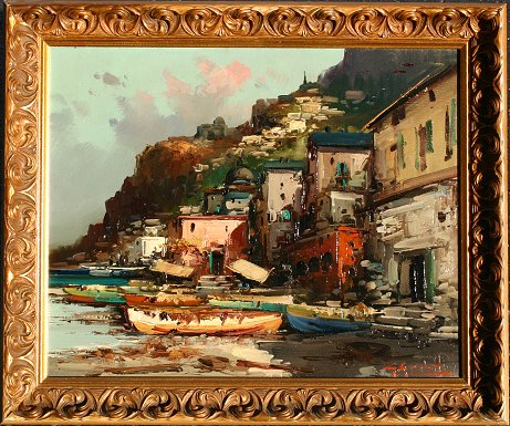 GUARLOTTI, Giovanni, (Italian, 1869-1954): Italian Fishing Village, O/CB, 15 1/2'' x 19 1/2'', signed, gesso frame, 19'' x 23''.