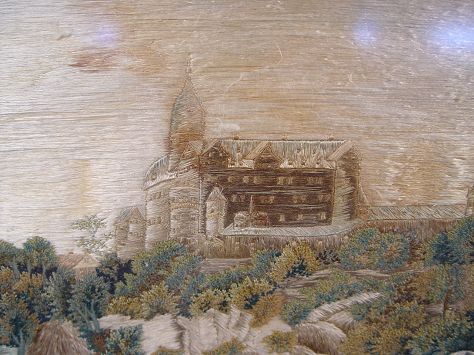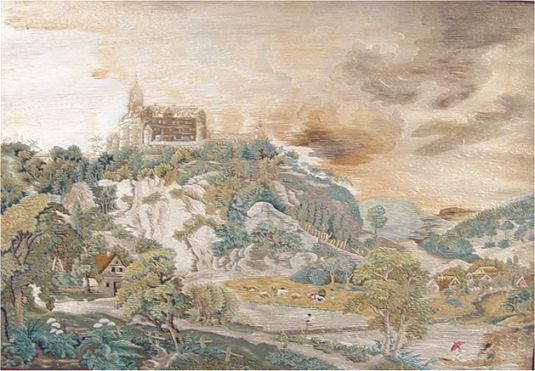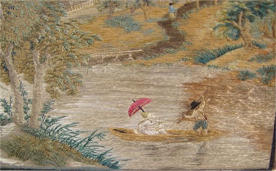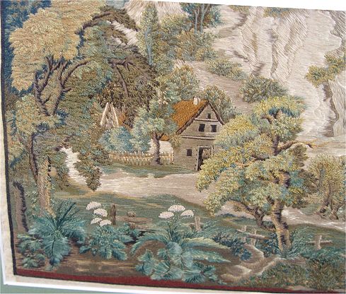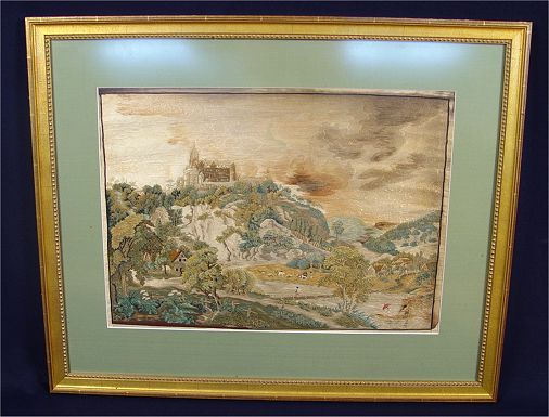 GENRE LANDSCAPE SCENE SILK NEEDLEWORK: Large church in the background, genre landscape in the foreground with exquisite detailing of cottages, figures on the paths, a couple in a boat, farm animals, and foliage. Framed and matted under glass, some dark staining. 23.5'' x 29'' overall, the needlework is 14.5 x 20.5.