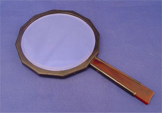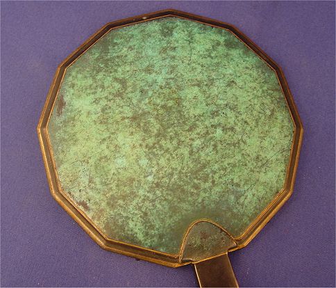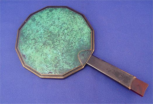 WMF IKORA BRONZE & BAKELITE HAND MIRROR: Round beveled mirror in a shaped frame of bronze with bakelite insert to handle, 9 1/4'' x 5 1/4''.