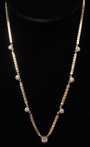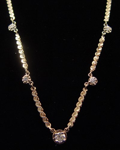 ''DIAMONDS BY THE INCH'' NECKLACE: 17 inch necklace of 14k yellow gold centered by a round brilliant cut diamond of approx. 25pts, stepping off each way approx. one inch will get you 6 more diamonds, approx. 8-10pts total, approx. 9 grams.