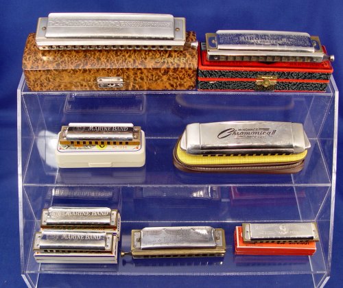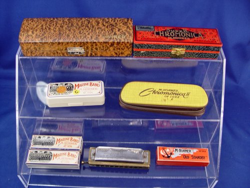 M. HORNER HARMONICA COLLECTION: To include, The 64 Chromonica 4 Chromatic Octaves Professional Model with case; Chromonica II DeLuxe C with zipper case; Super Chromonica No 270 G; three Marine Band No 1896 A440s C in hard case and an F & a Bb in cardboard cases; Old Standby No 34B 440 Bb in cardboard case; and last but not least the one most used based on condition - The Chromonica - no case, a few dents and a crack to the wood - still works.