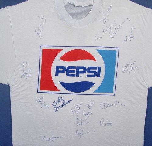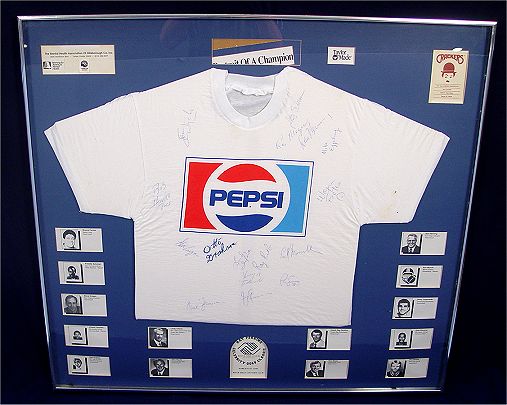 CHAMPION FOOTBALL AUTOGRAPHED PEPSI T-SHIRT: 1990 fund raiser for the Boys & Girls Clubs of Tampa Bay - Ray Perkins Celebrity Golf Classic March 8-10, 1990 River Hills Country Club. Signatures include, Otto Graham - Cleveland Browns Quarterback; Earl Morrall - Miami Dolphins QB; Vinny Testaverde - Tampa Bay Buccaneers QB; Phil Simms - New York Giants QB; Wayne Fontes - Detroit Lions - Head Coach; Freddie Soloman - San Francisco 49'ers Wide Receiver; Steve Grogan - New England Patriots QB; Chuck Foreman Minnesota Vikings Running Back; Lindy Infante - Green Bay Packers Head Coach; Sam Wyche - Cincinnati Bengals Head Coach; Dan Henning - San Diego Chargers Head Coach; and Joey Browner - Minnesota Vikings Defensive Back. Framed behind glass, overall 32 3/8'' x 35 1/4''. Please note slight discolored section of left sleeve, no signatures affected.