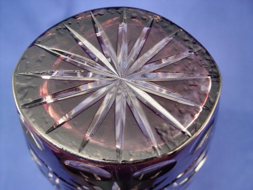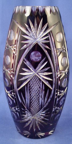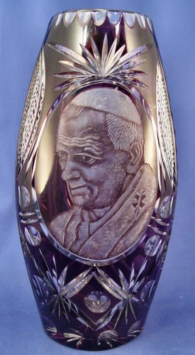 POPE JOHN PAUL II POLISH AMETHYST CUT TO CLEAR VASE: Tall cut glass vase with the image of Poland's own Pope Paul John II. 14 1/2''h.
