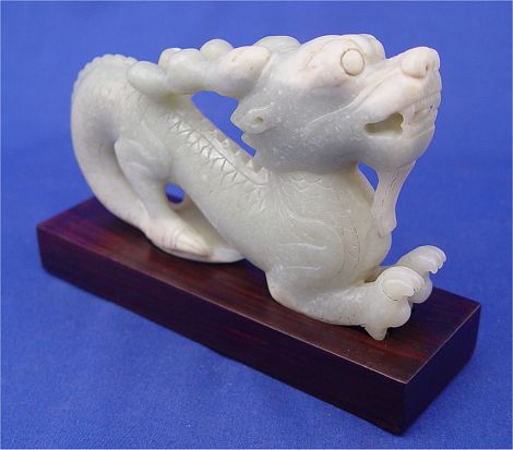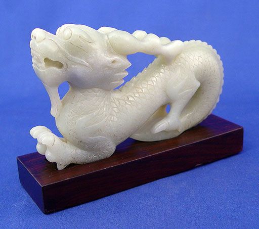 CHINESE CARVED CELADON JADE FIGURE OF A DRAGON: 3 3/4''h. x 4''. Sold with the wooden stand and presentation box. Est. $400/600**