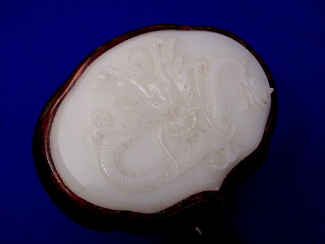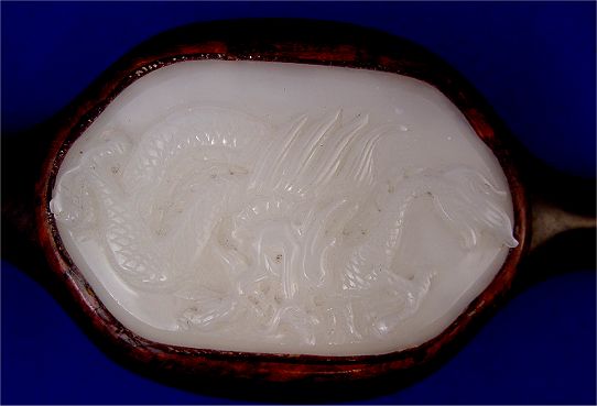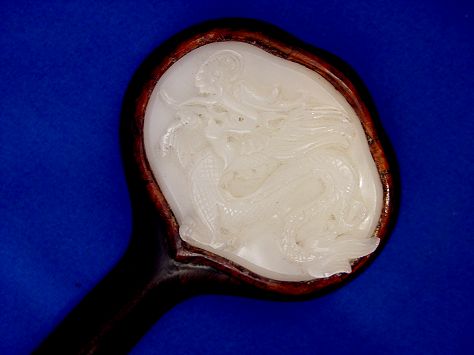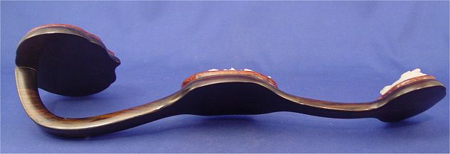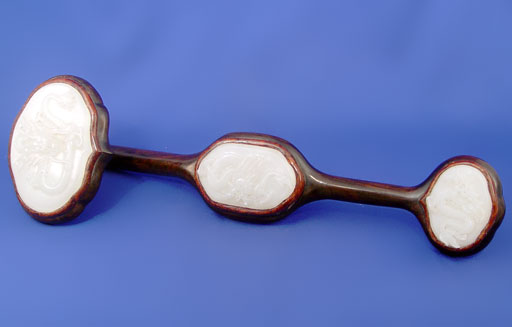 CHINESE CARVED JADE AND ROSEWOOD RUYI: Intricately carved jade plaques on rosewood, 19''l. Est. $800/1200**