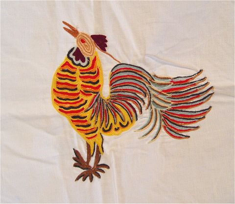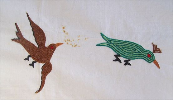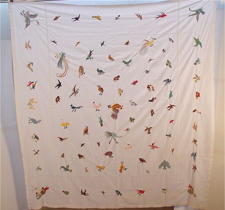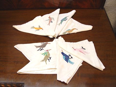 BIRDS OF KASHMIR HAND EMBROIDERED TABLE COVER AND NAPKINS: Purchases in India mid 1900's. The cloth is covered in embroidered images of the birds of Kashmir, each of the 8 napkins have a single bird.