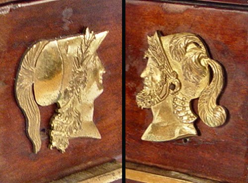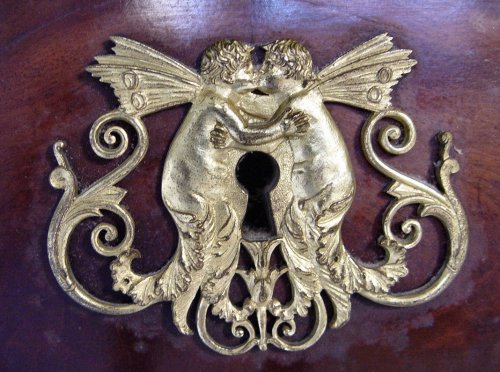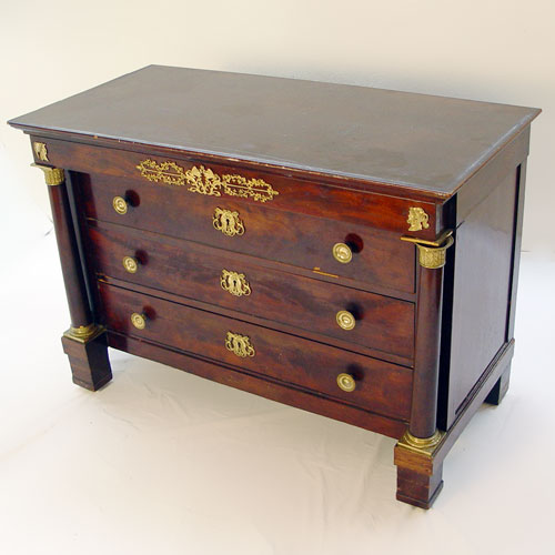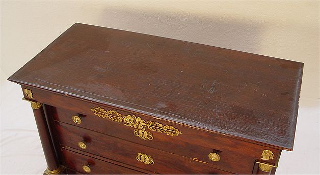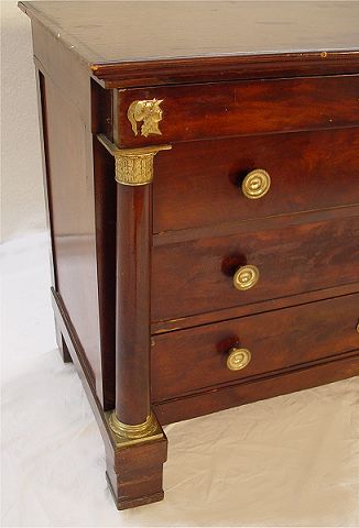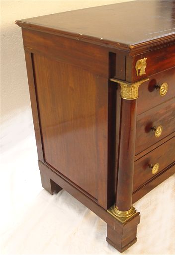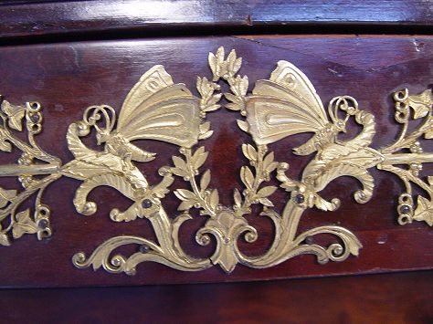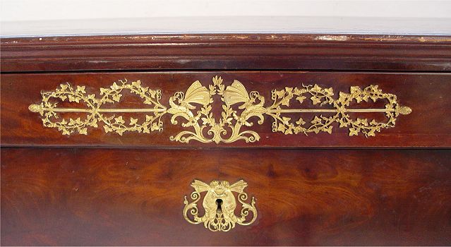 FRENCH EMPIRE ORMOLU CHEST: The most amazing ormolu- the escutcheons are two fairies kissing, the top drawer has ivy ormolu with moths, masquerons on each of the two top corners. Overhanging top drawer, 3 lower drawers with brass knob pulls. Columnar stiles, raised on substantial square feet, 36''h. x 51 1/2''w. x 24 1/2''d.