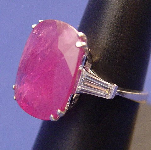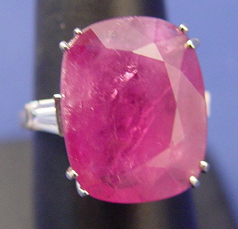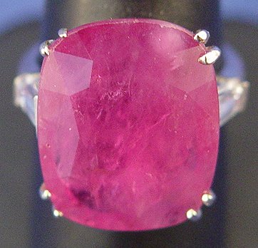 13.45CTW RUBY & WHITE SAPPHIRE RING: Large semi-transparent ruby prong set in 18k white gold with two tapered baguette cut white sapphires, size 6.75, marked 750, 8 grams.