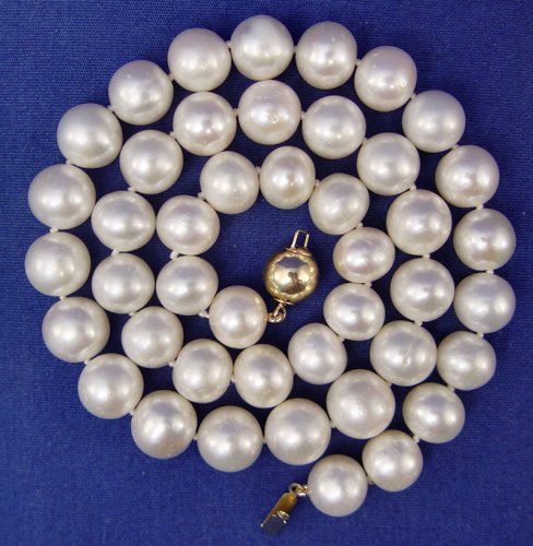 11-12MM CULTURED SOUTH SEA PEARL NECKLACE: 20''l. strand of well matched off white silver tone cultured pearls, approx. 11 to 12mm, 14k yellow gold ball clasp. Suggested retail $4900 sold at no reserve.