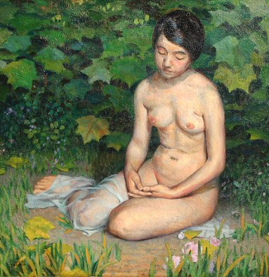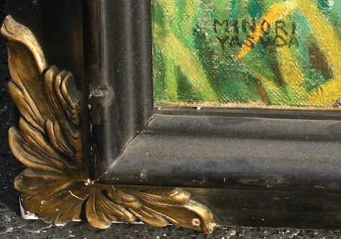 JAPANESE KNEELING NUDE CIRCA 1940: O/C, Signed Minori Yasuda, 39 1/2'' x 39'', period black frame with gilt accents, 47'' x 46 1/2''. Relined with scattered inpaint visible by blacklight. Est. $5000/8000**