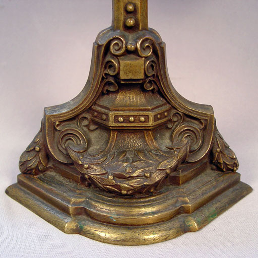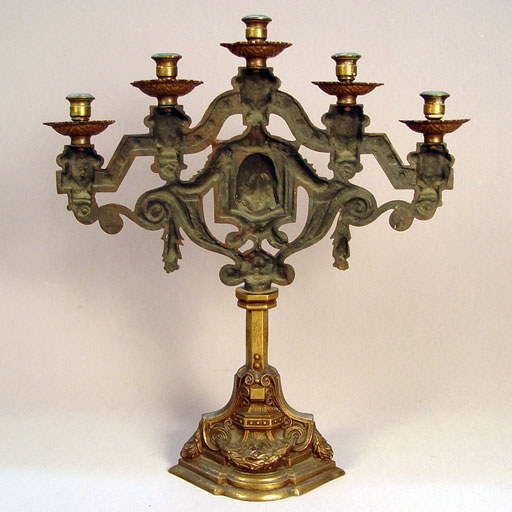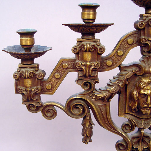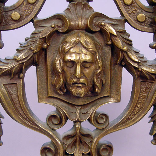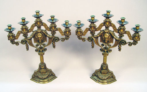 PAIR BRONZE CANDELABRA CA 1880'S: 5 light candelabra, centering an image of a Christ. 21''h. 18'' wide. Est. $600/800**