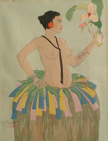 JACOULET, Paul, (French, 1902-1960): ''BELLE DE YAP ET ORCHIDEES'', Woodblock, 19'' x 14 1/2'' with margins, pencil signed, numbered 212/350 verso. Foxing in upper margin under the mat.