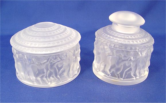 LALIQUE ENFANTS DRESSER JAR AND SCENT BOTTLE: French frosted crystal. Signed ''Lalique R France''. The covered jar is 3''h, 4 1/4'' dia. The scent bottle is 4''h, 4'' dia. Est. $500/800**