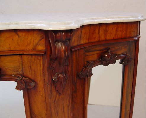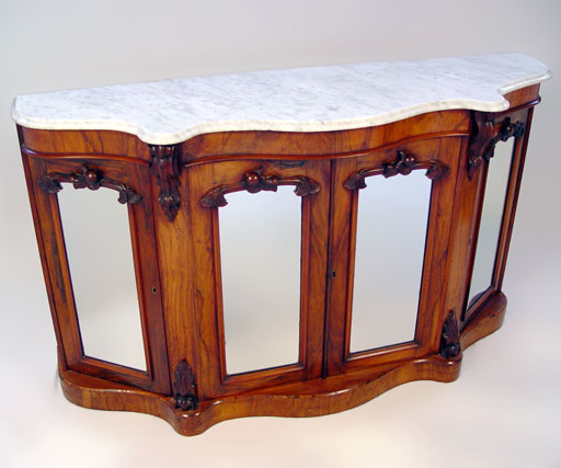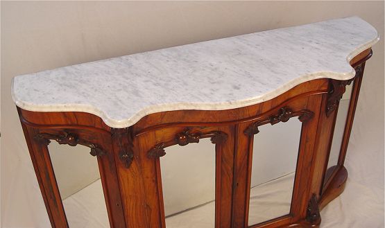 A FINE VICTORIAN MAHOGANY MARBLE TOP SIDEBOARD: Richly grained wood possibly rosewood. White marble top over a cabinet of three doors, mirrored front panels on the doors, carvings above the mirrors. 35''h. x 59'' x 18''.