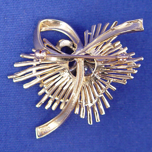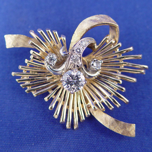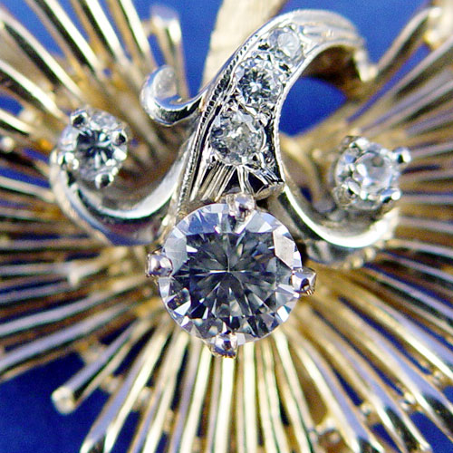 94ctw DIAMOND & GOLD BROOCH: Featuring a round brilliant cut diamonds of approx. 72pts VVS2 clarity and I color, set in white gold with a further .22ctw of smaller diamonds, mounted on a yellow gold spray pin with bar pin closure, 10.5 grams. Sold with current Florida Diamond Appraisers appraisal, $5350 retail replacement value.