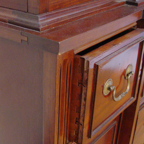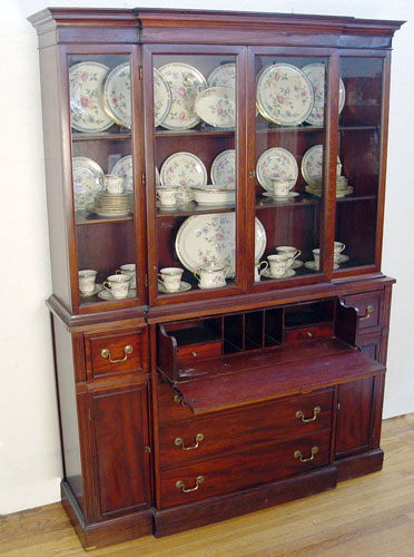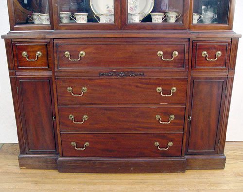 MAHOGANY BREAKFRONT SECRETARY: Two part cabinet with upper for books or china, lower with desk and storage. 78'' h. x 55'' x 12 1/4''.