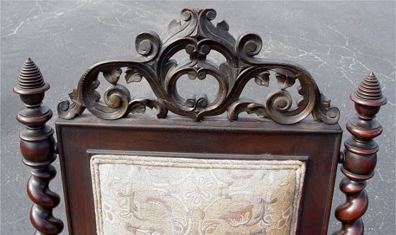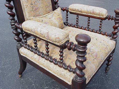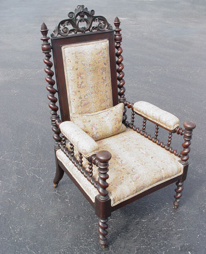 SPIRAL CARVED MAHOGANY HIGH BACK ARMCHAIR CA 1840: Carved top rail, spiral stiles, sides and arms. Bun hand holds and padded arm rests. 47''H. X 25'' X 26''.