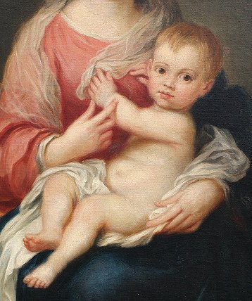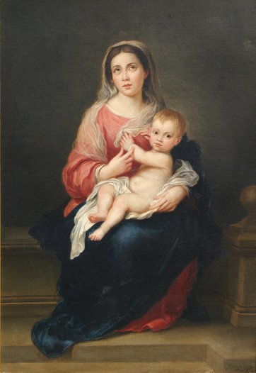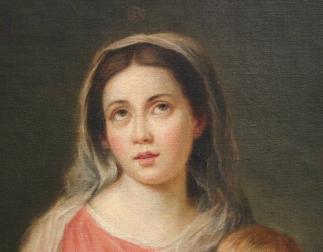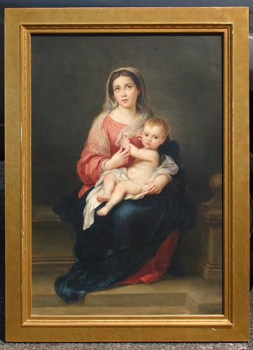 19TH C. MADONNA & CHILD O/C AFTER MURILLO: 42'' x 28 1/2'', illegibly signed and dated 1896, period golden oak liner, 49'' x 36'', a superior copy of an old master religious classic. Relined, older inpaint and repair, good overall. Est. $1500/2500**