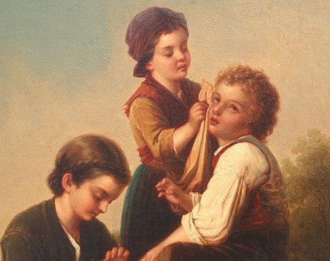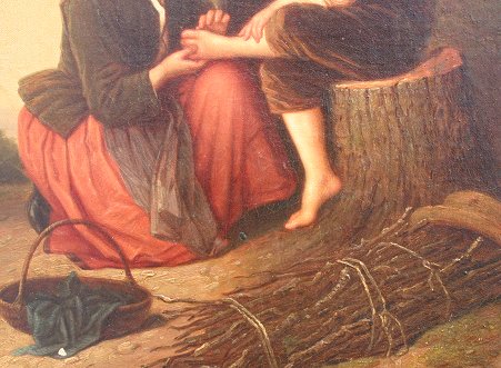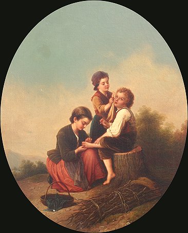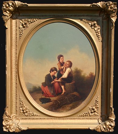19TH C AMERICAN SCHOOL PAINTING ''REMOVING THE SPLINTER/FAGGOT GATHERER'S AT REST'': O/C/B, 26'' x 22'', unsigned, in oval period frame with wear and overpaint, 37'' x 32''. Several flecks, laid down on board with scattered older inpaint restoration. Est. $2000/4000**