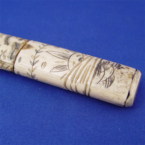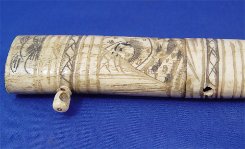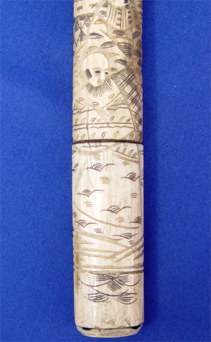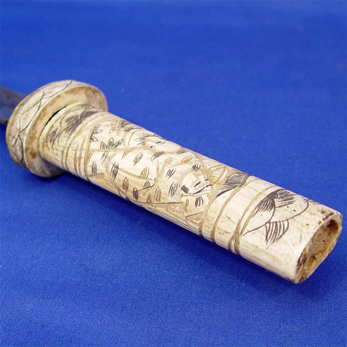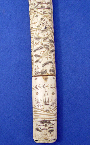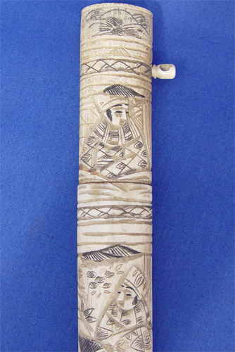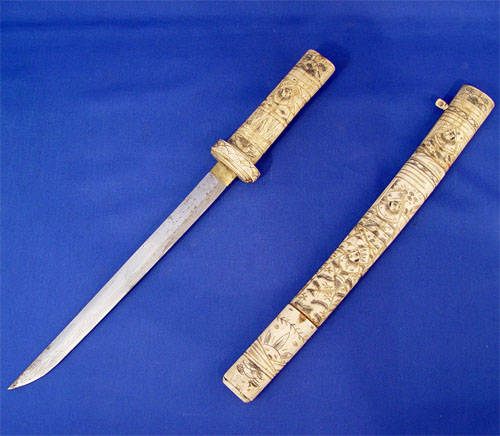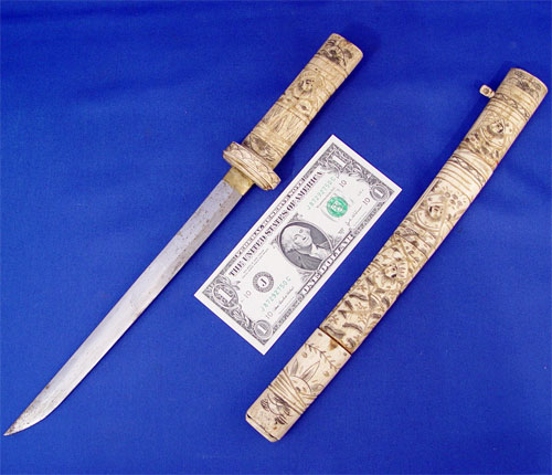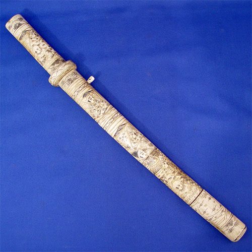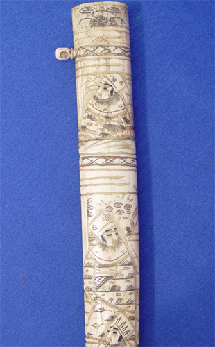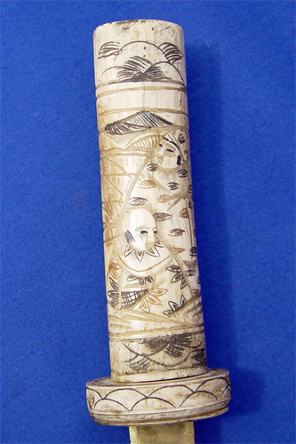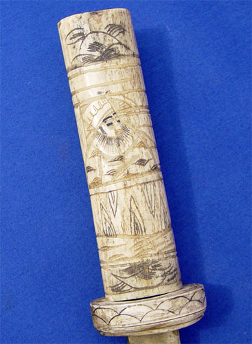 JAPANESE CARVED BONE SHOTO OR WAKIZASHI SWORD: All over carvings on sheath, tsuba, and handle. 18''l, the blade is 10''.