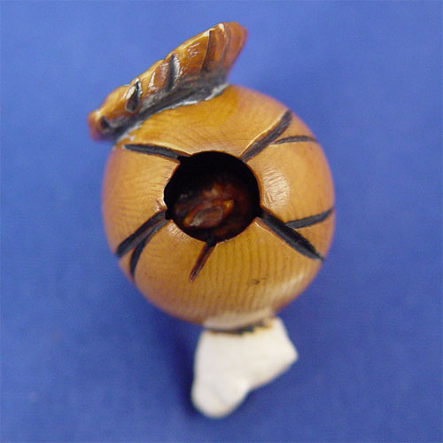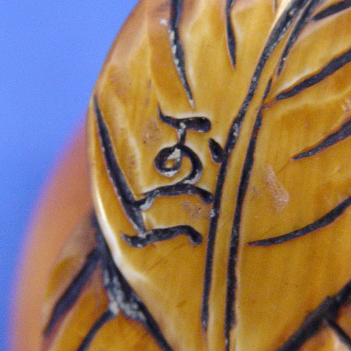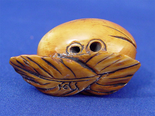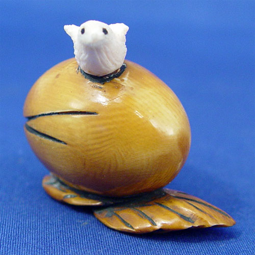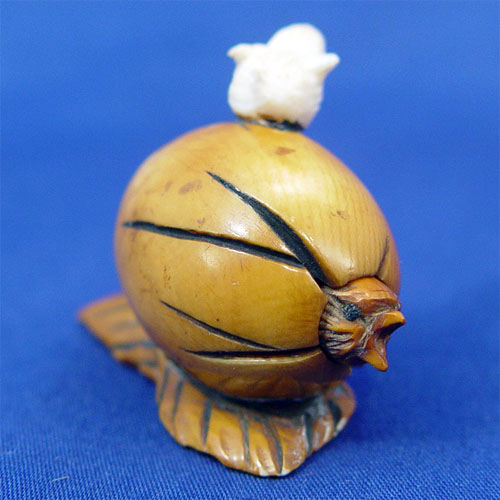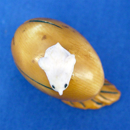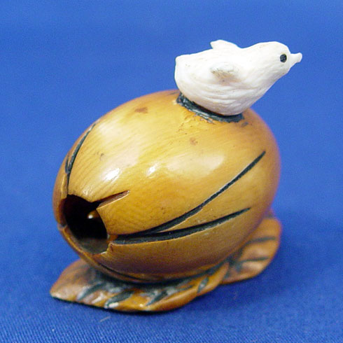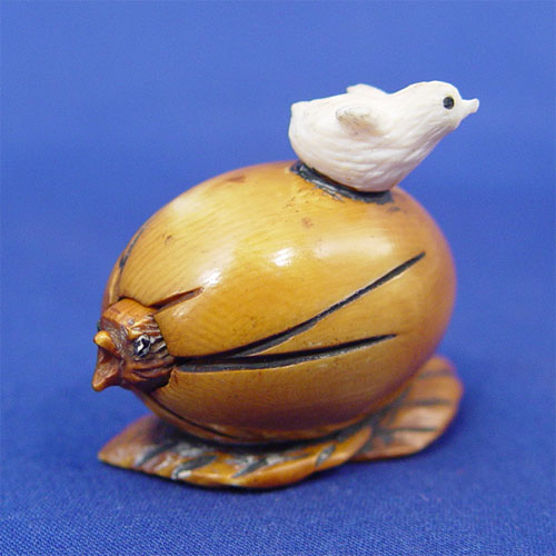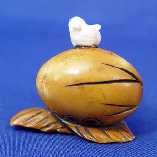 CARVED IVORY EGG AND BIRD NETSUKE: Egg with peeking bird inside, white bird resting on top. Artist signed. 1 1/2''h. x 2''.