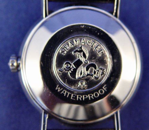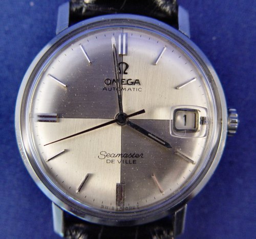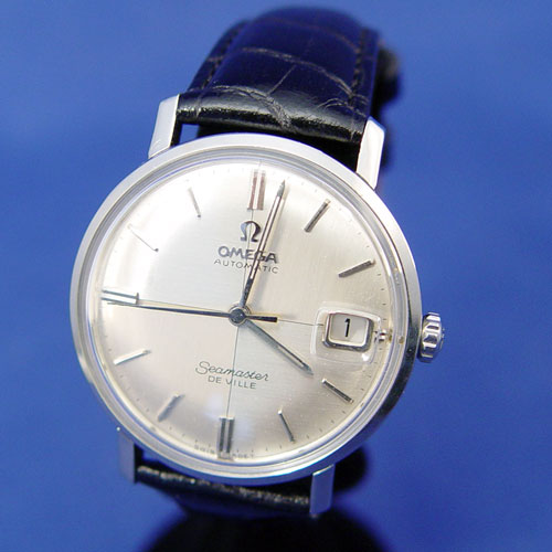 GENTLEMAN'S OMEGA SEAMASTER DEVILLE AUTOMATIC DATE WATCH: Model 560, 17 jewel, serial #21284307, inside case marked Acier Inoxydable 166020, Omega symbol to outside back and on stem, lovely quarter dial with date at three o'clock, stainless steel case with leather band 9''.